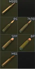 5.45mm用BS(通用)或7N39(高穿);5.56mm闭眼选M995;9×39mm用SPP/BP;7.62×51mm首选M61。牢记穿深机制:穿深>护甲厚度×80%概率击穿;碎弹=150%伤害,跳弹=头盔不掉耐久但头部钝伤1HP。
