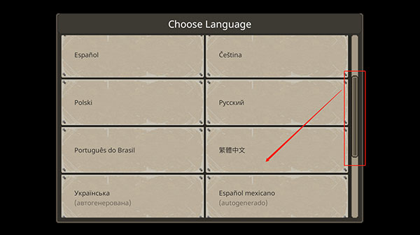 1、首次启动游戏时,需手动选择语言。向下滑动列表,找到“繁体中文”并点击确认即可切换;