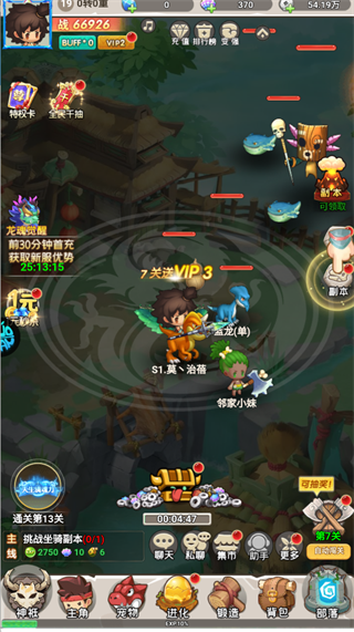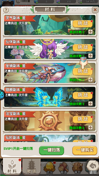 材料副本产出灵气、伙伴碎片、坐骑进阶材料、翅膀组件等全品类养成资源。每日挑战可稳定获取升星所需素材,SVIP玩家更可使用一键扫荡功能,大幅提升刷本效率。