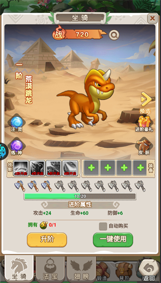 坐骑可通过升阶提升攻击、生命、防御等基础属性,并解锁专属技能。此外,还支持注灵、炼神、皮肤更换等深度养成方式,全方位增强角色综合战力。