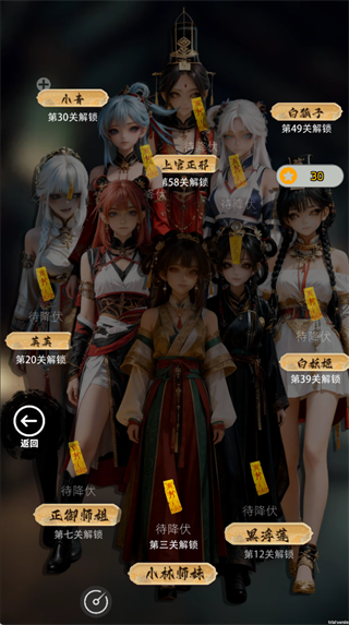 藏妖阁完整展示了所有可收服的女妖角色。每位女妖对应特定的关卡解锁条件,通关相应关卡后即可尝试降伏该女妖并纳入麾下。